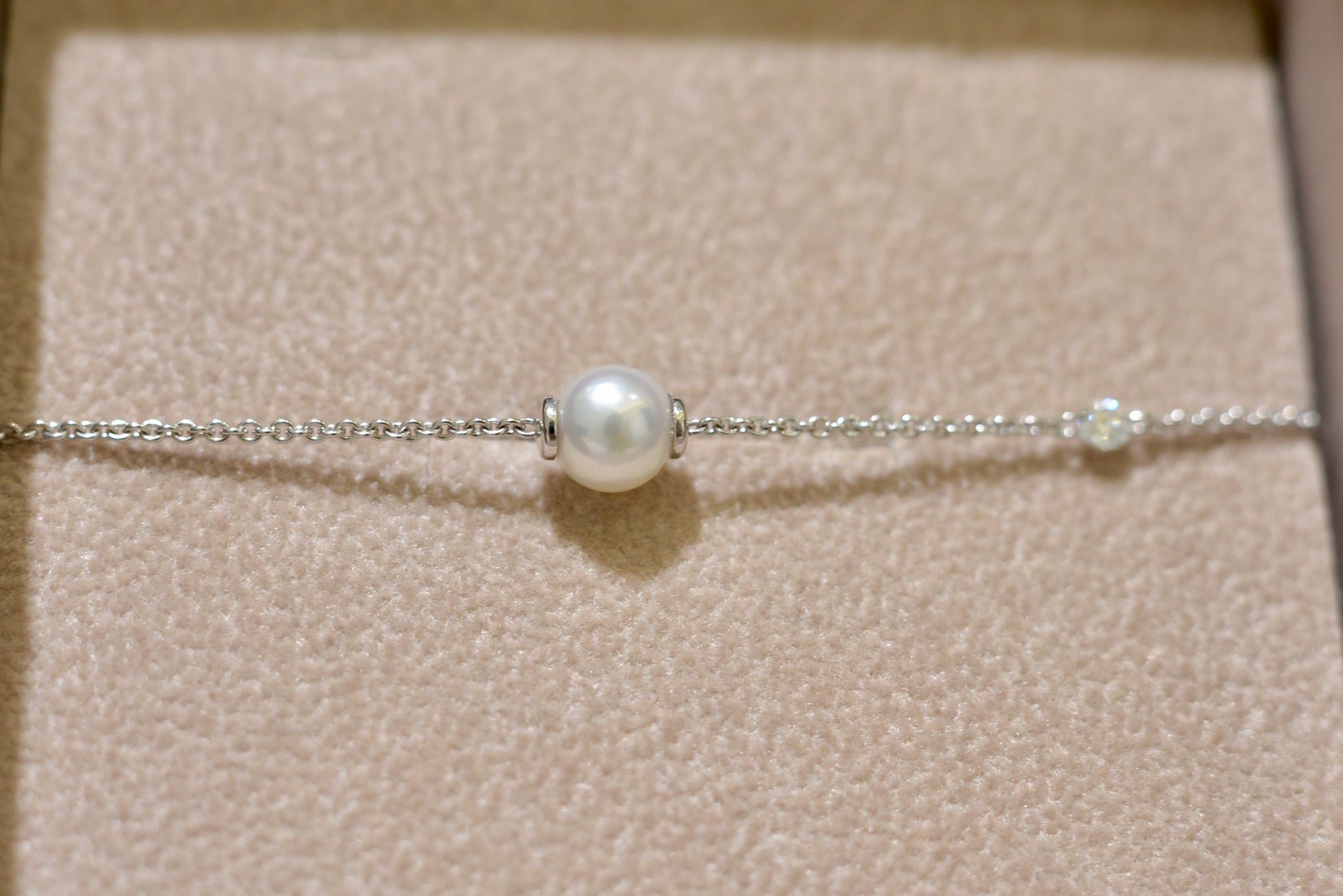 18 karátos fehér arany karkötő Akoya gyönggyel, melyet egy átfúrt gyémánt tesz mèg különlegesebbé.