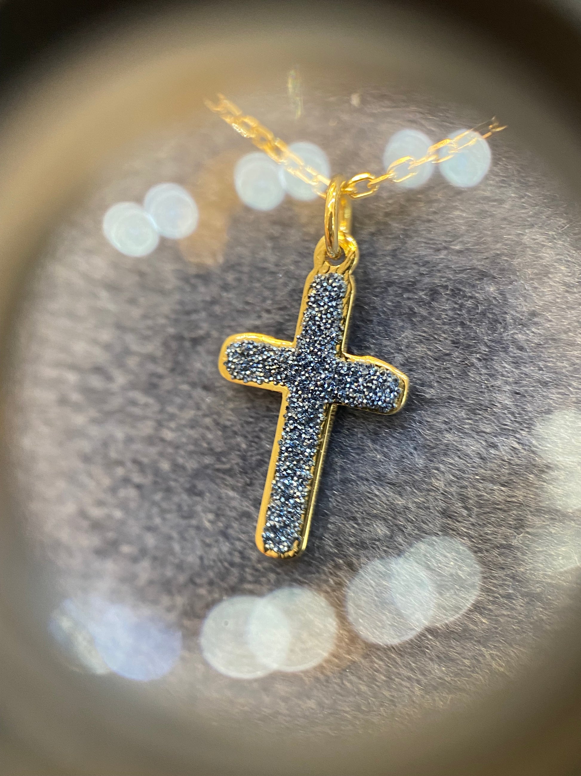 18 karátos sárga arany nyaklánc, lógó kereszttel, kék gyémántporral díszítve.