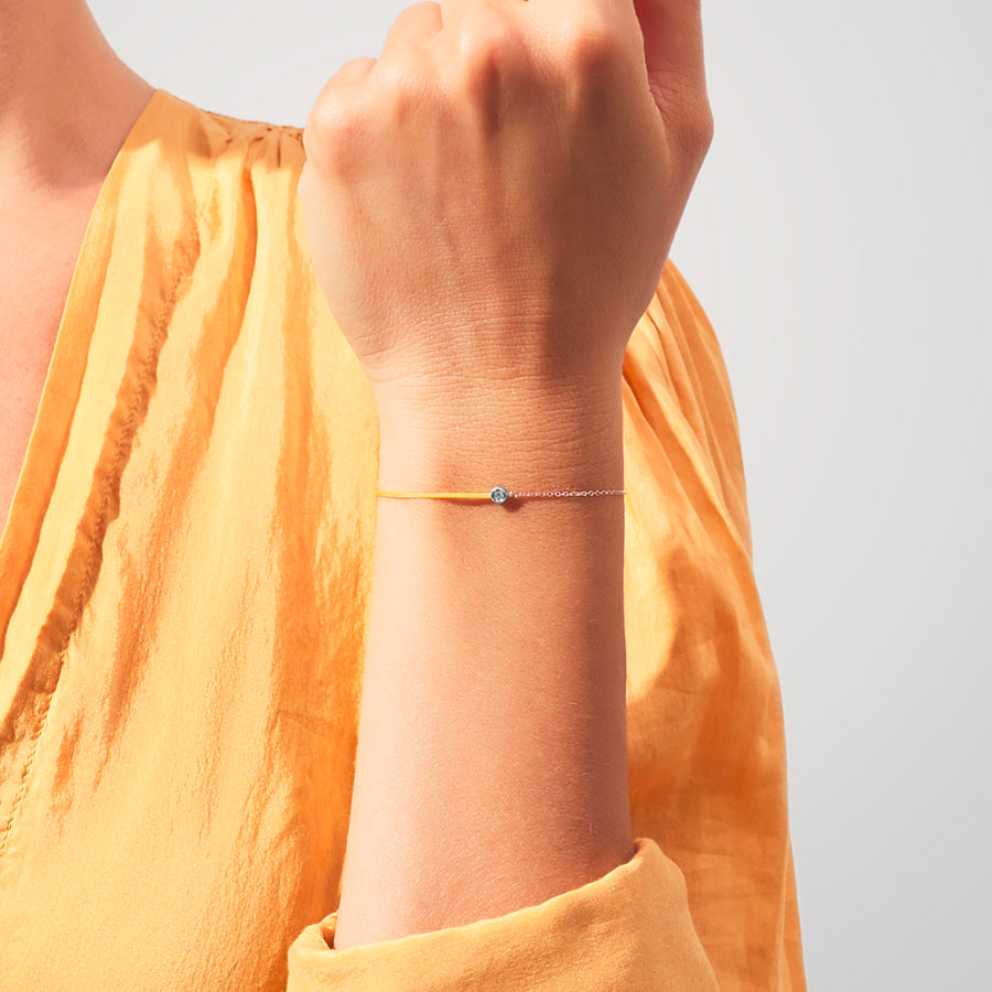 A La Palette by Caterina B karkötői még azokat is elvarázsolják, akik eddig nem hordtak ékszereket. A 0,02 ct fehér gyémánt diszkrét megjelenése mellett két elemet köt össze: a lánc aranyát és a színes madzagot. Ez egyszerre ad eleganciát és laza megjelenést, így a hétköznapokra vagy különleges eseményekre is nagy szívvel ajánljuk.