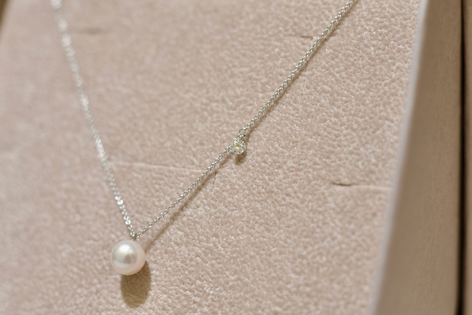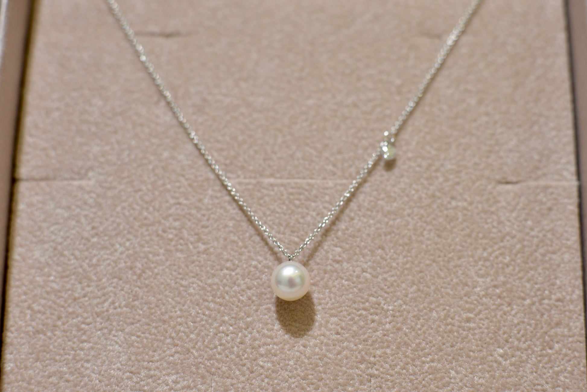 18 karátos fehér arany nyaklánc Akoya gyönggyel, melyet egy átfúrt gyémánt tesz mèg különlegesebbé.