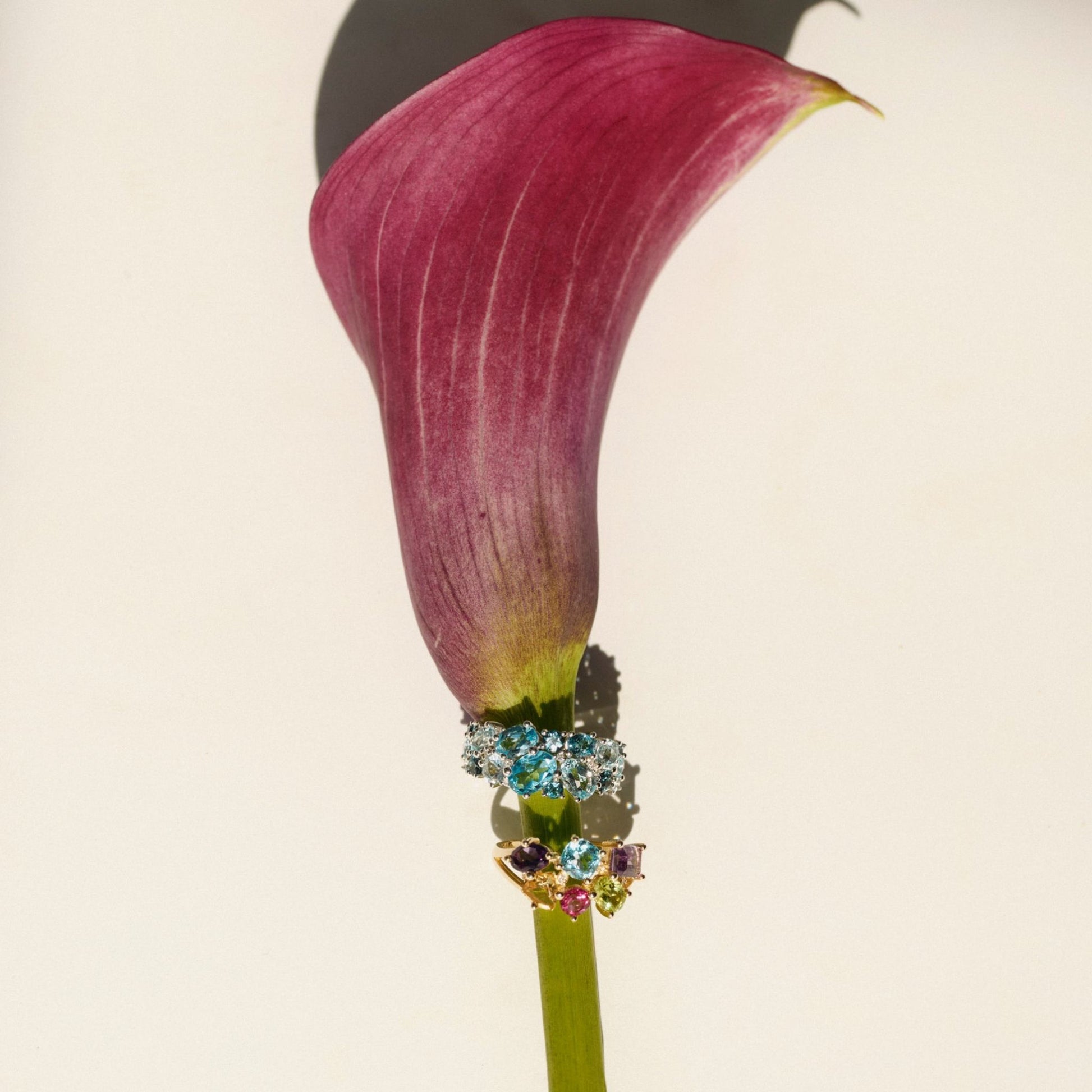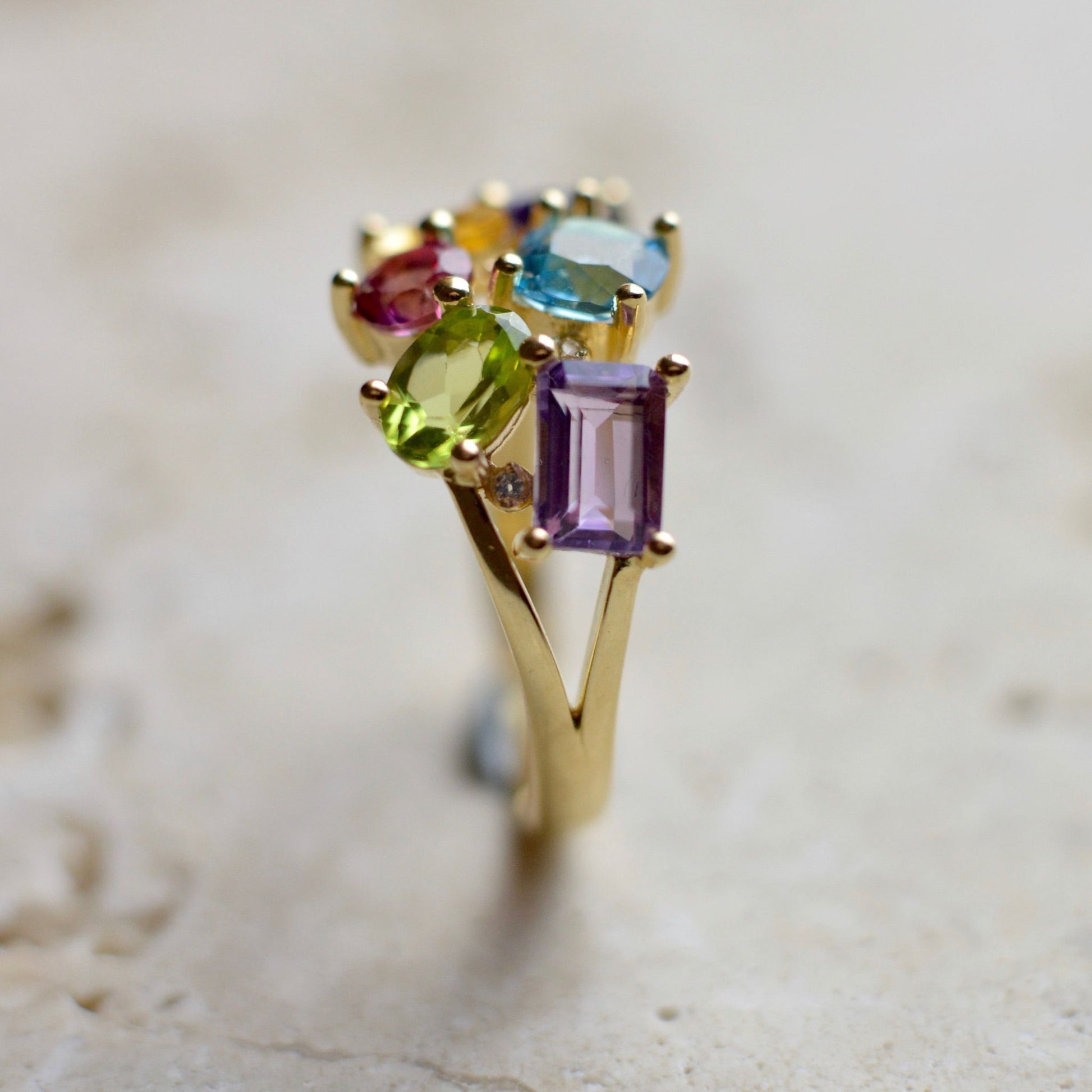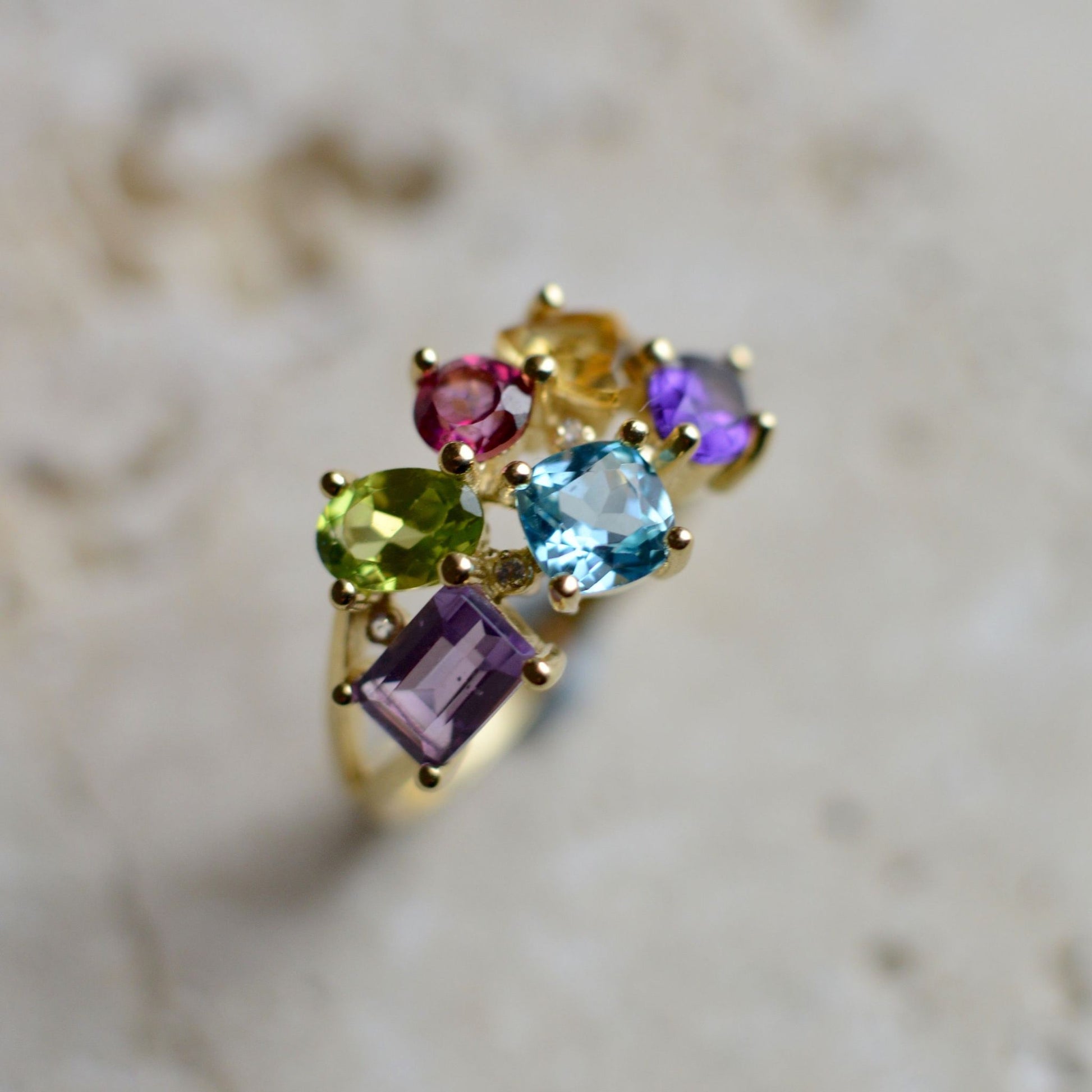 Sárga arany gyűrű, különböző színű, csiszolású drágakövekkel. Az igazán extra megjelenésért. Megtalálható benne Topáz, Citrin, Ametiszt, Olivin.